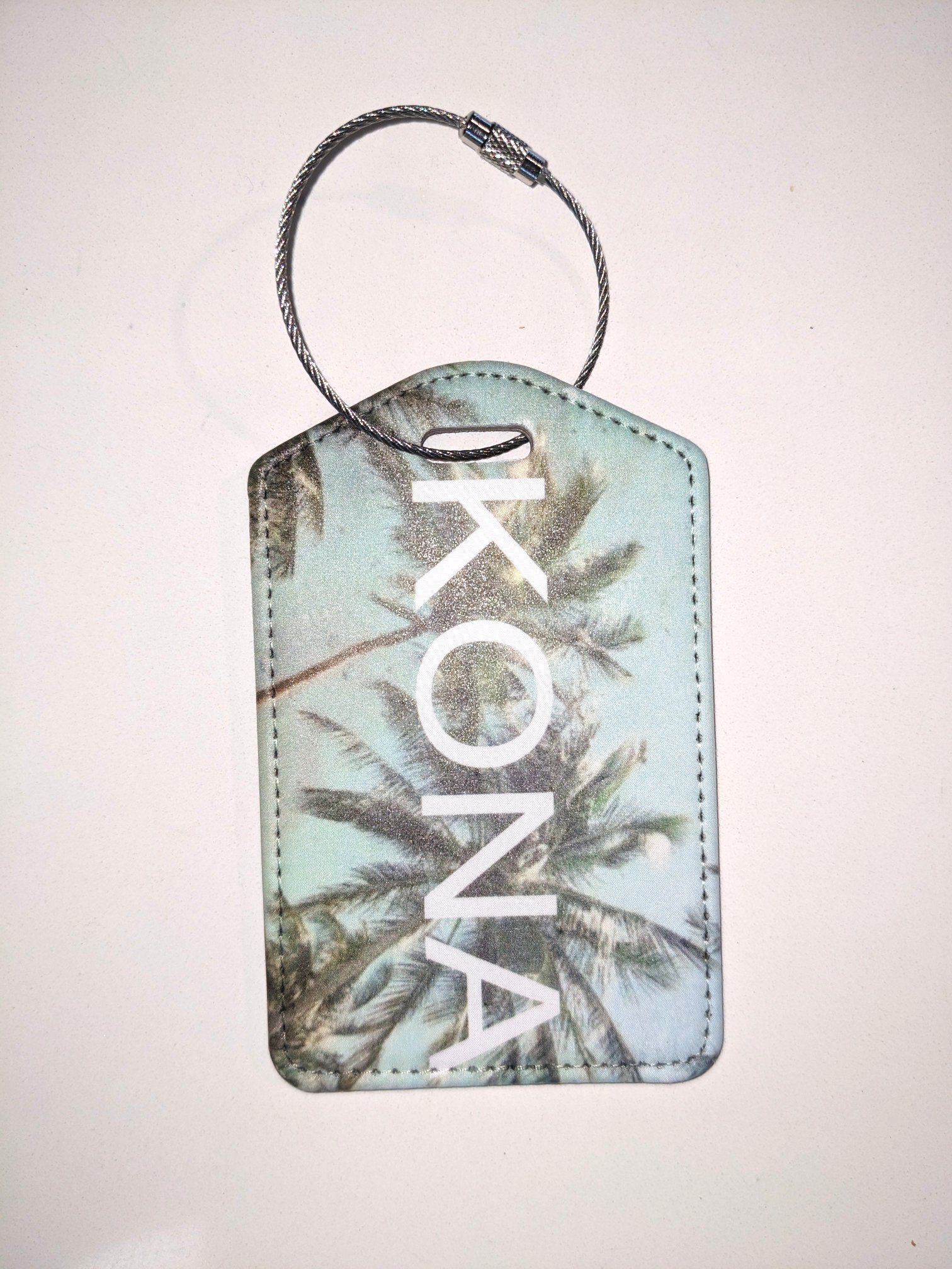 - A little bling with aloha for your luggage. Beautiful image produced on quality synthetic leather with a stainless steel metal ring for attaching to your luggage or backpack.